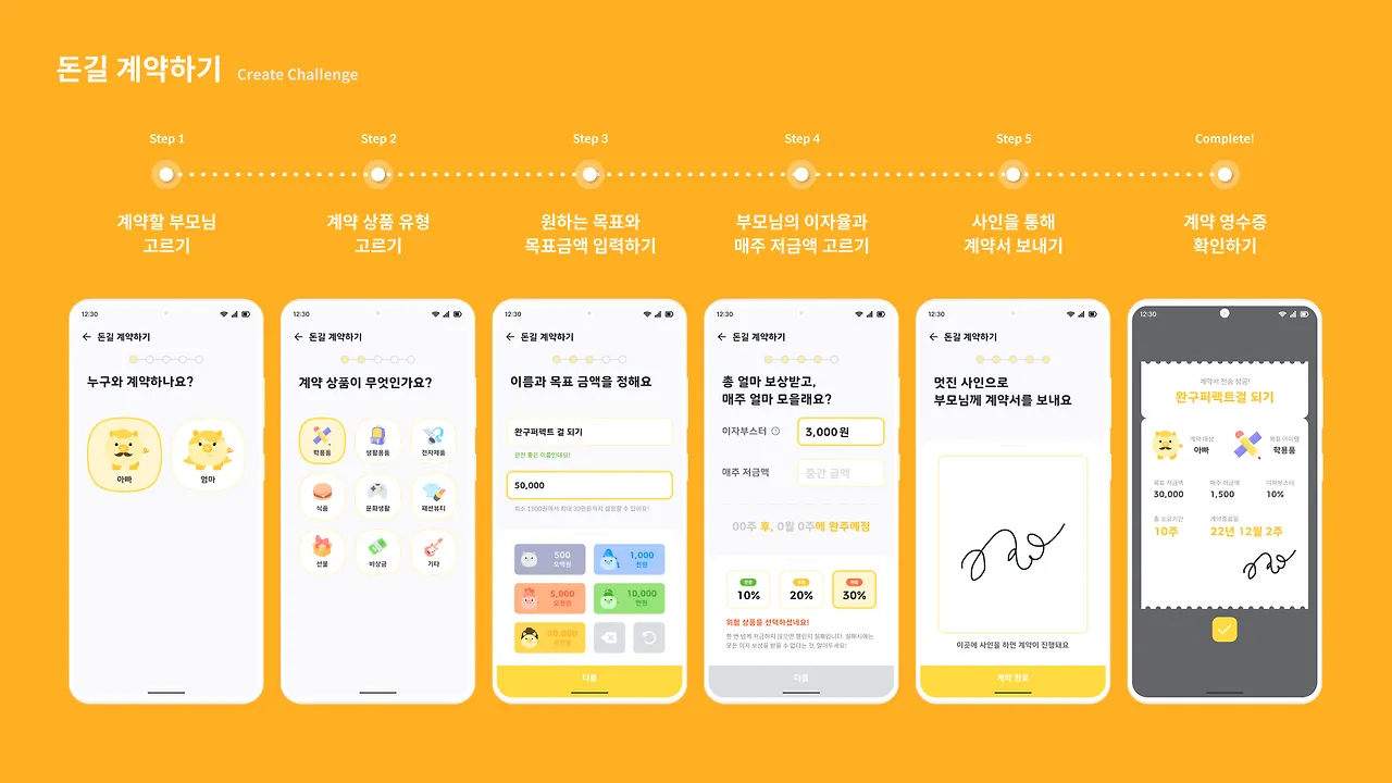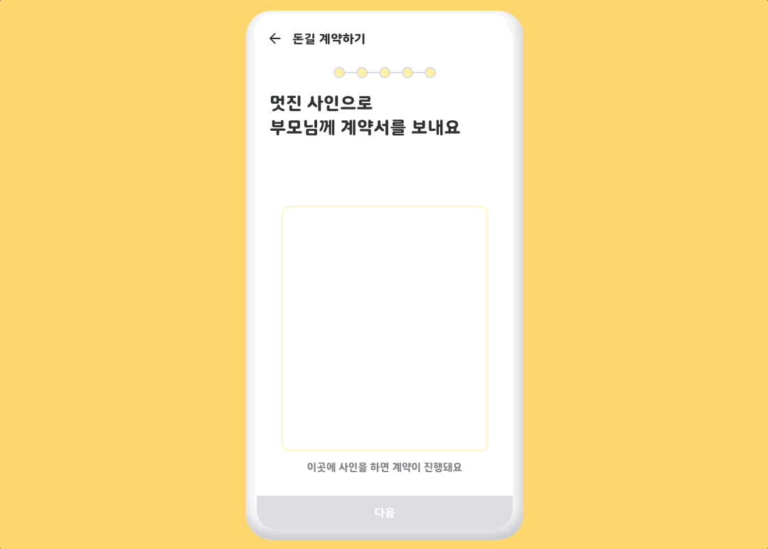 특별할건 없는 단순 구현이지만 많이 고민하고 노력한게 아까워서 적는 포스팅. 앱의 가장 핵심인 돈길을 생성하는 과정을 ‘돈길 계약하기’라는 워딩을 통해 아이들도 재미있게 느낄 수 있도록 했다. 총 다섯개의 단계를 밟아 정보를 입력하고, 마지막에 사인을 하고 제출하면 계약 영수증이 보여지는 형식이다. 기획과 디자인팀의 노고가 느껴진다. 그리고 저걸 구현한 나도… 기능 하나하나에 많은 공을 들였어서 그런지 특히 애정이 있는 뷰들이다.