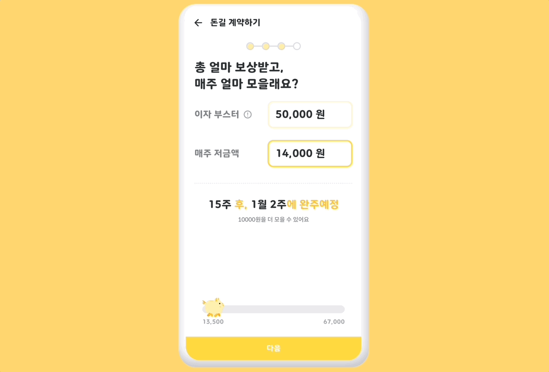 뱅키즈에서 계약할 수 있는 기간은 3주부터 15주까지이다. 이에 맞추려고 (이자부스터를 제외한) 혼자 모으는 금액에 3 또는 15를 나눈 금액으로 상한 하한을 설정한다. 기본값은 이자율이 20%인 경우를 보여줌.